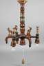 um 1920, ungemarkt, Holz gedrechselt und geschnitzt, polychrom gefasst und in Bauernmalerei verziert, Balusterschaft mit drei Leuchterarmen und vier abgehängten Lampenfassungen, dekoriert mit aufgesteckten vollplastischen, figürlichen Schnitzereien, H ca. 75 cm, D ca. 50 cm.