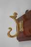 um 1905, ungemarkt, bräunlich lackiertes Nussbaumpaneel mit drei montierten, c-förmig geschwungenen Kleiderhaken aus Bronze, Gebrauchsspuren, L 37 cm.