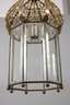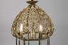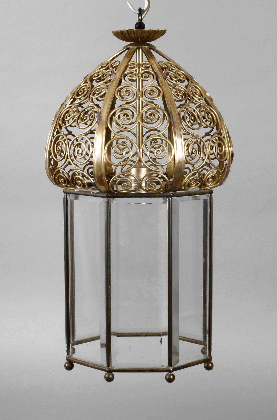 um 1915, durchbrochen gearbeiteter, von Spiralmotiven verzierter Baldachin aus vergoldetem Metall, polygonal facettierte Montierung mit eingesetzten facettgeschliffenen Klarglassegmenten, einflammig elektrifiziert, etwas berieben, H 45 cm, D ca. 25 cm.