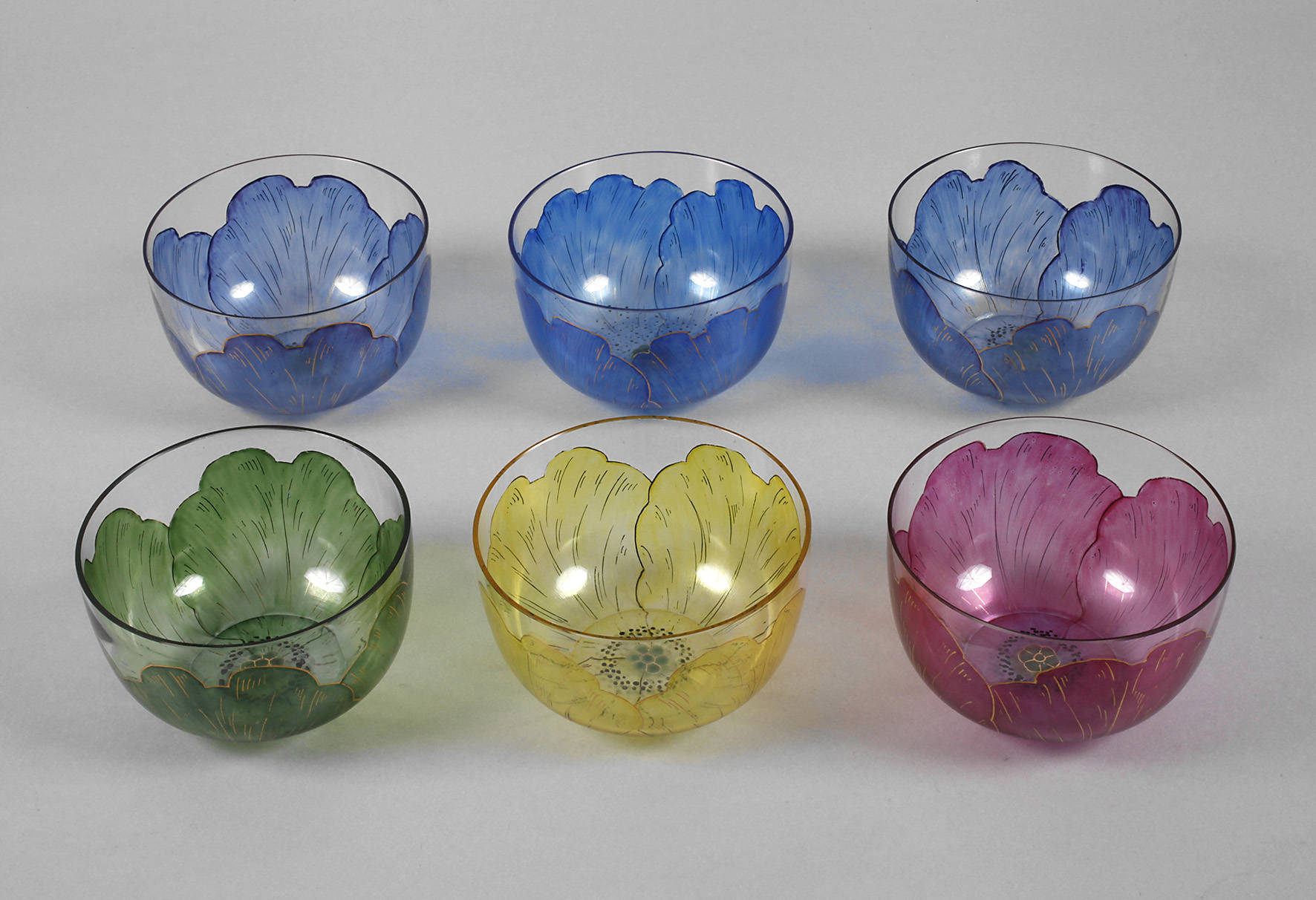 Petersdorf, um 1900, farbloses Glas, ausgekugelter Abriss, mit transparenten Emailfarben und Gold bemalt, Blütendekor, eine mit winziger Kerbe an der Mündung, sonst geringe Altersspuren, D je 11 cm.