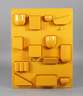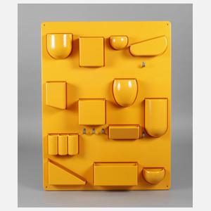 Entwurf Dorothee Becker 1969, gemarkt A product of M. Munich West-Germany, orangefarbener Kunststoff, rechteckige Wandplatte mit untersch. geformten Behältnissen zur Aufbewahrung, vier Bohrungen zur Wandbefestigung, mit fünf originalen Haken, min. Altersspuren, Maße 70 x 51 cm.