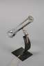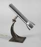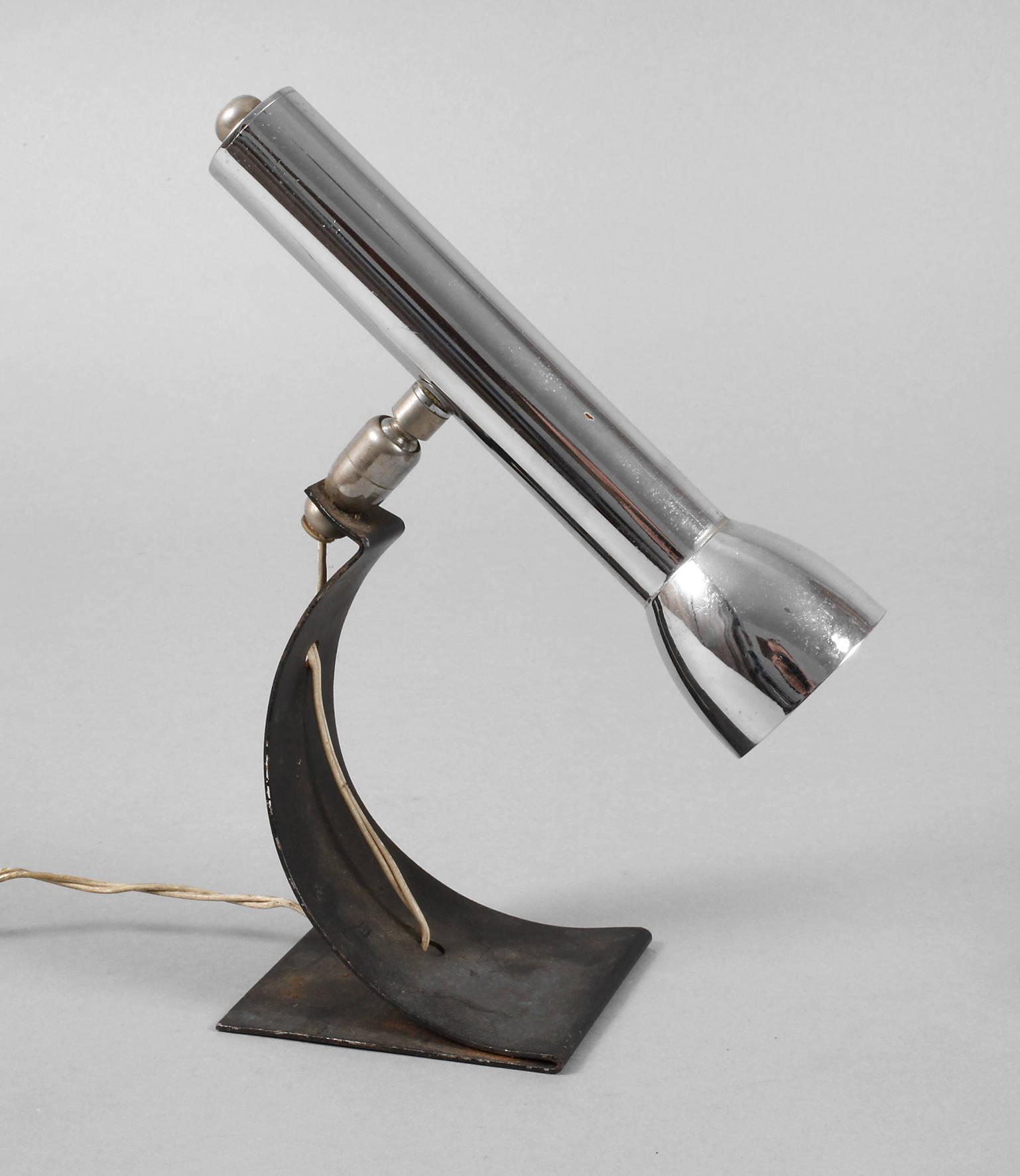 Italien, 1970er Jahre, ungemarkt, Weißblech, teils geschwärzt bzw. verchromt, geschwungener Leuchterarm mit an Kugelgelenk verstellbarer zylindrischer Fassung, einflammig alt elektrifiziert, H ca. 21 cm.