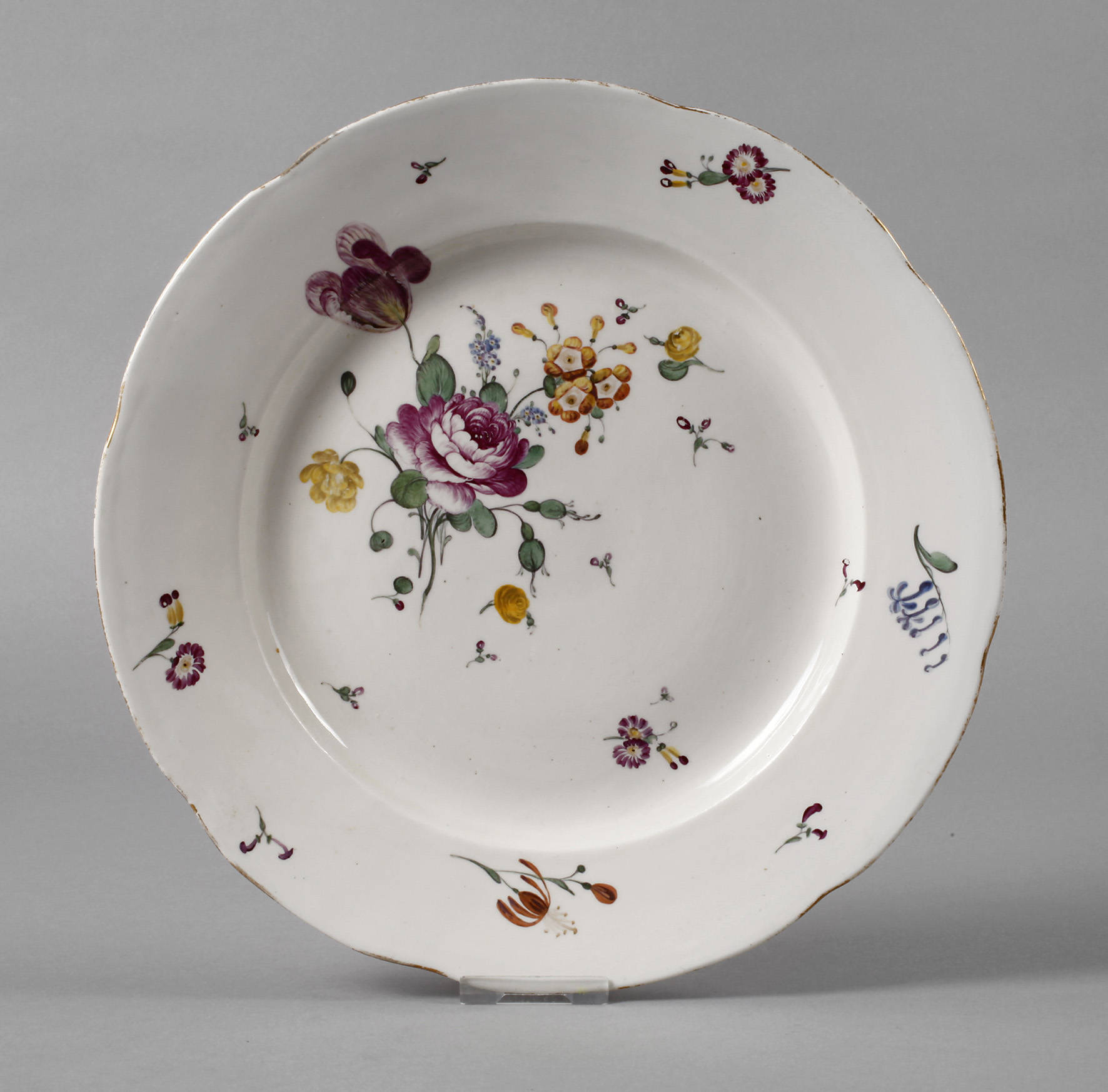 unterglasurblaue Carl-Theodor-Marke 1762-1794, Ritzzeichen N 2, flach gemuldeter Speiseteller mit geschweiftem Rand, Blumenbukett und Streublümchen in feiner polychromer Aufglasurbemalung sowie Goldrand, dieser stark berieben, brandfleckig, D 25 cm.