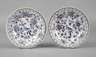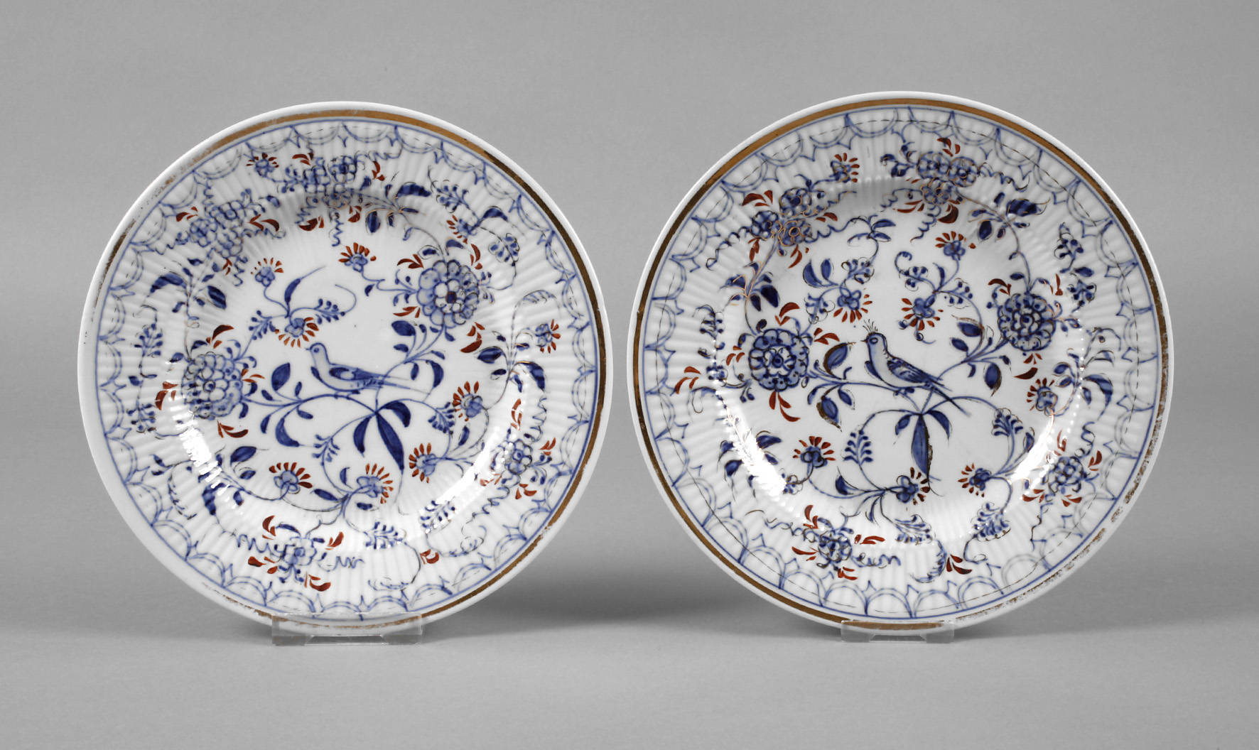 unterglasurblaue Fähnchenmarke mit Zusatz Rn 1850-1897, Pinselnummer 1, Reliefdekor ”Gebrochener Stab”, kobaltblaue Unterglasurbemalung mit Blumenranken und mittig sitzendem Vogel, rot- und goldschattiert, Goldrand, Vergoldung unterschiedlich stark berieben, D je 20 cm.