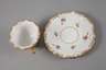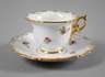Entwurf Johann Daniel Schöne um 1814, unterglasurblaue Schwertermarke mit vier Schleifstrichen, Jahreszeichen für 1971, Prägenummern, Empire-Form mit reliefiertem Muschelrand, Dekor in feiner polychromer Aufglasurbemalung, Goldstaffage, H Tasse mit Untertasse 6 cm.