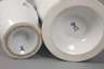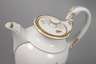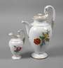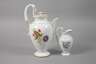 aus dem Service ”Schwanenhals”, unterglasurblaue Schwertermarken Pfeifferzeit 1924-1934, vier Schleifstriche, Deckel mit Pinselnummer, bzw. unterglasurblaue Knaufschwertermarke 1860-1924, 1. Wahl, beide mit Prägenummern, ovoide Form, Schwanenhalshenkel und plastischer Blütenknauf, beidseitig Dekor ”Blume 3 schräg” bzw. Blume 1” in feiner polychromer Aufglasurbemalung, Goldstaffage, Kanne mit kleinen Brandfehlern, H 17,5 und 31 cm.