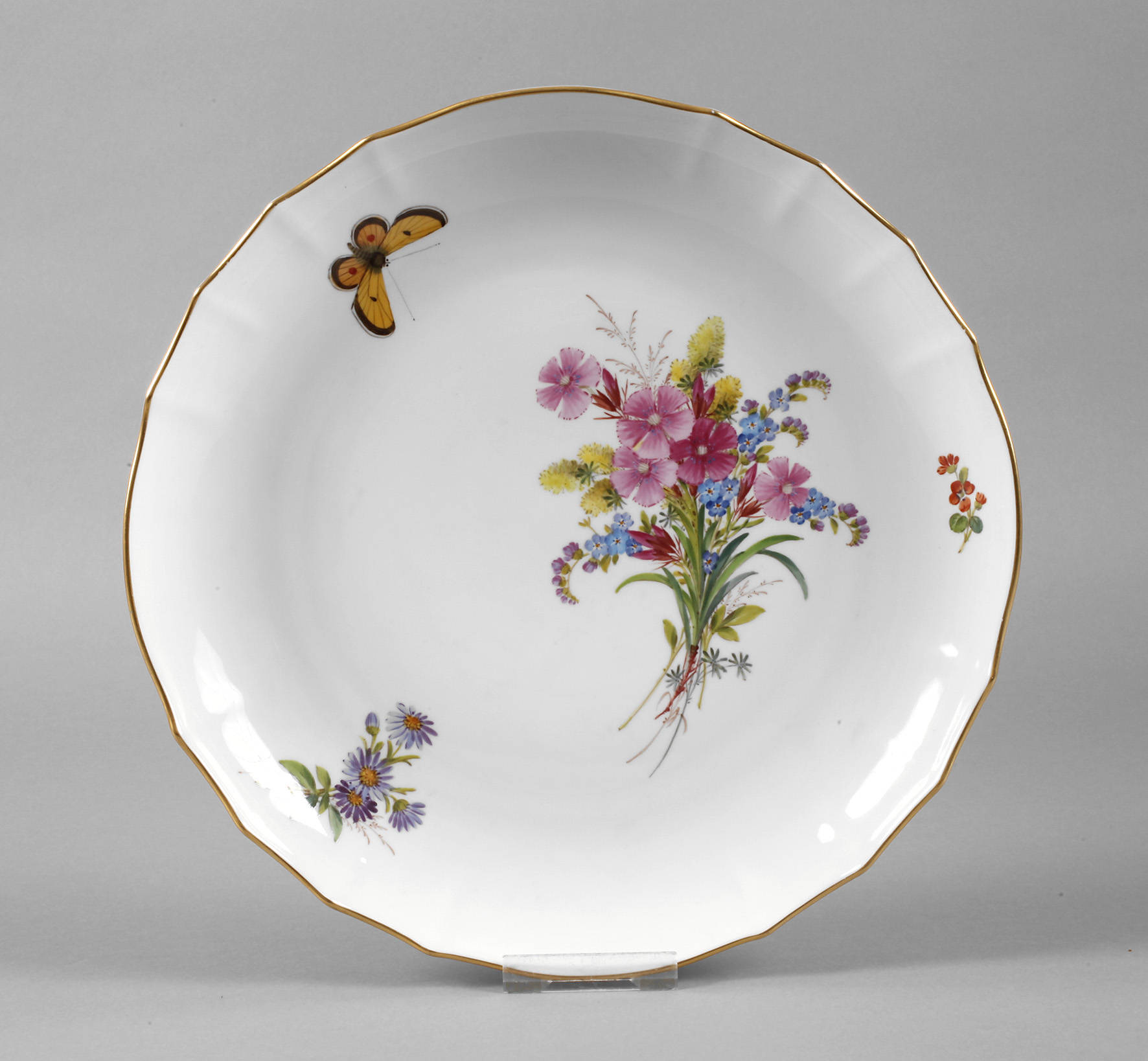 unterglasurblaue Schwertermarke, Jahreszeichen für 1980, 1. Wahl, Präge- und Pinselnummern, Form ”Neuer Ausschnitt”, Blumenbukett, Streublümchen und Schmetterling in feiner polychromer Aufglasurbemalung, Goldrand, D 28 cm.