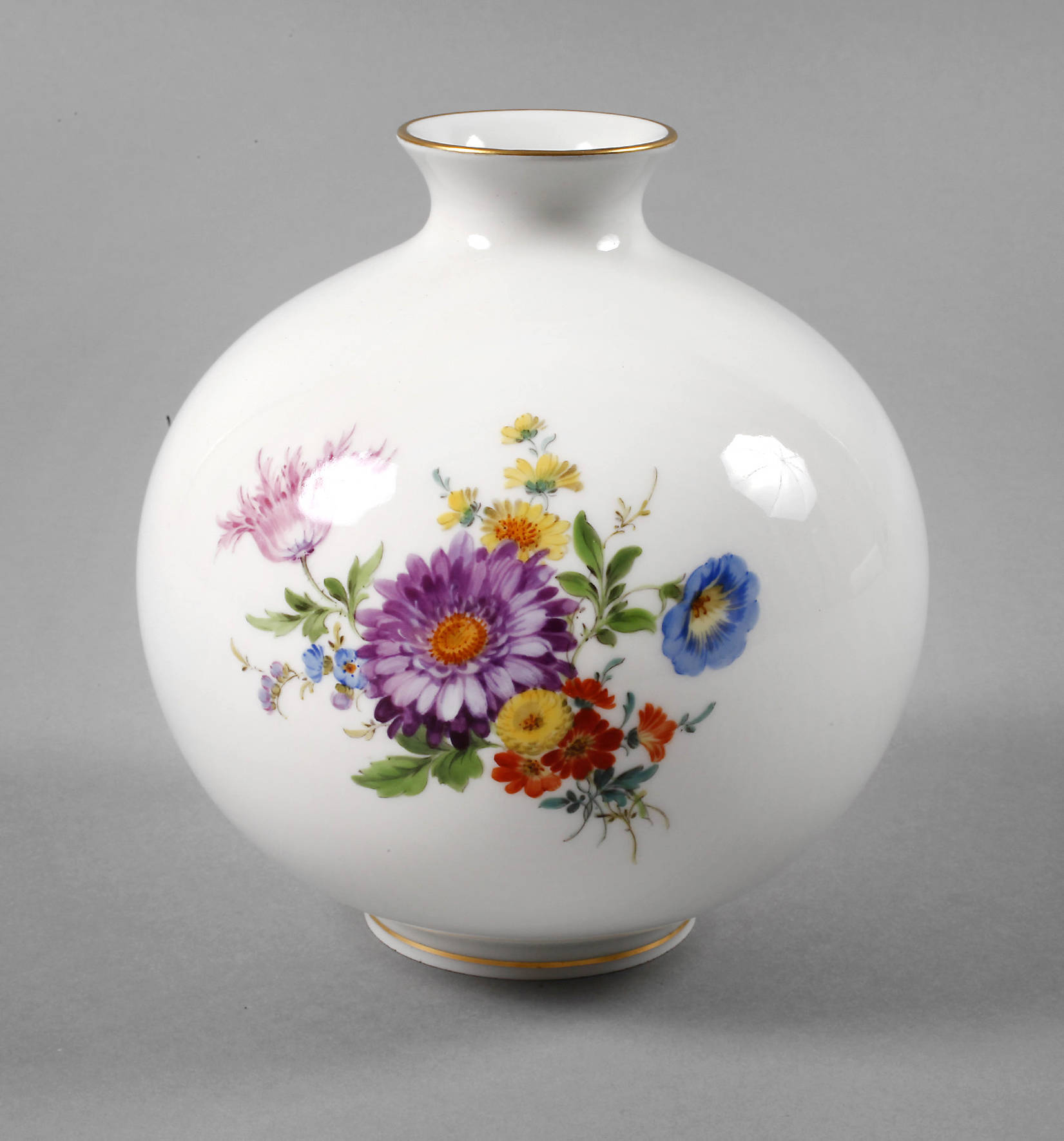 unterglasurblaue Schwertermarke, 1. Wahl, Jahreszeichen für 1952, Präge- und Pinselnummern, feine polychrome Aufglasurmalerei, Goldrand, H 16,5 cm.