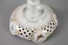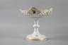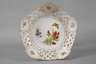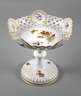 unterglasurblaue Schwertermarke, undeutliches Jahreszeichen für 1980, 1. Wahl, Präge- und Pinselnummern, zweiteilig, über gedreht geripptem Rundfuß in Balusterform durchbrochen gearbeitete Flechtrandschale mit fünf Rocaillekartuschen, allseitig Goldstaffage und feine polychrome Aufglasurmalerei mit Wiesenblumen und Schmetterlingen, H 22,5 cm.