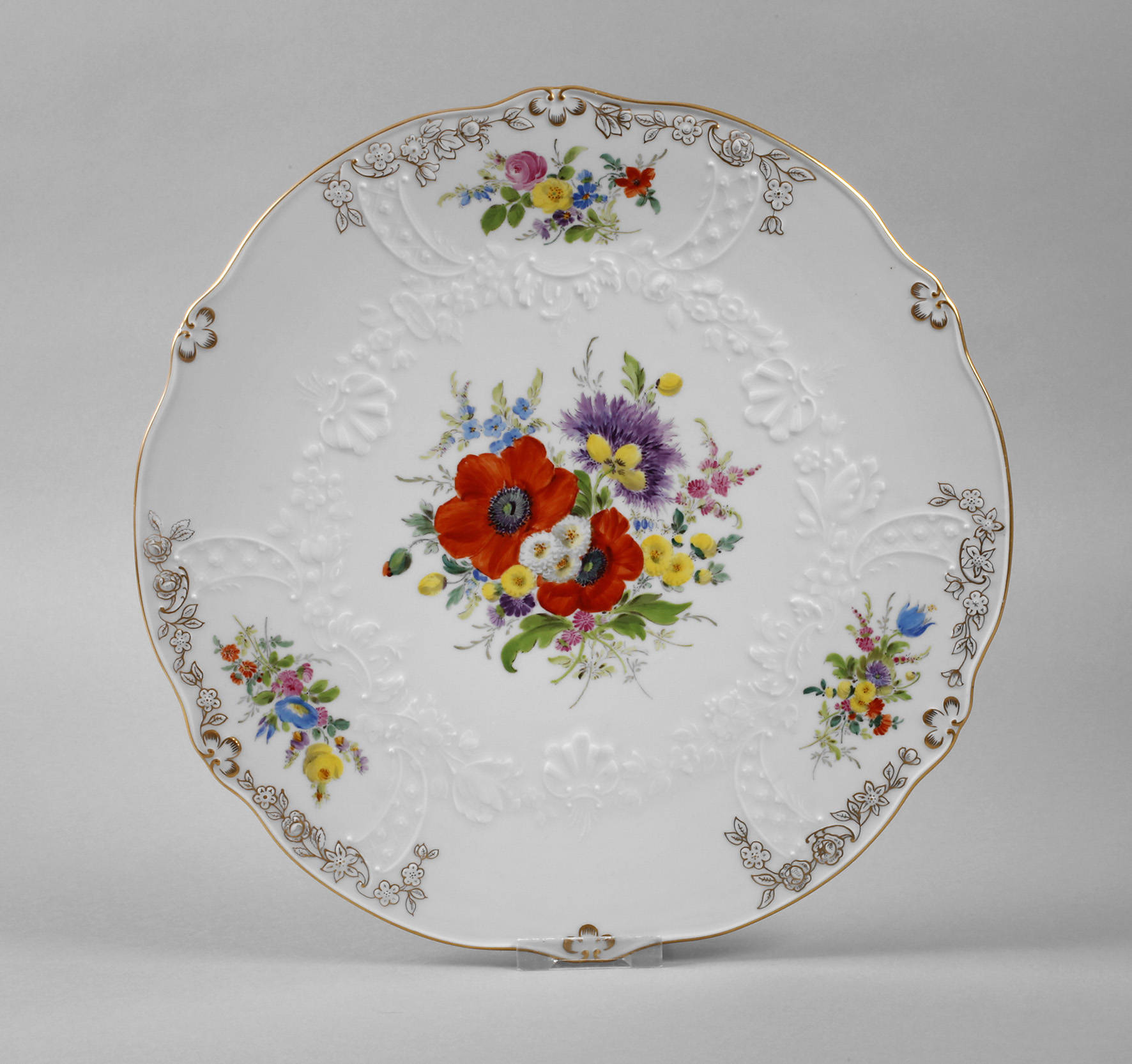unterglasurblaue Schwertermarke mit zwei Schleifstrichen und Weißschnitt, Jahreszeichen für 1976, Prägenummern, Reliefdekor ”Neumarseille”, feine polychrome Aufglasurbemalung und Goldstaffage, Goldrand, D 33 cm.