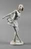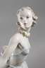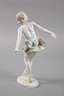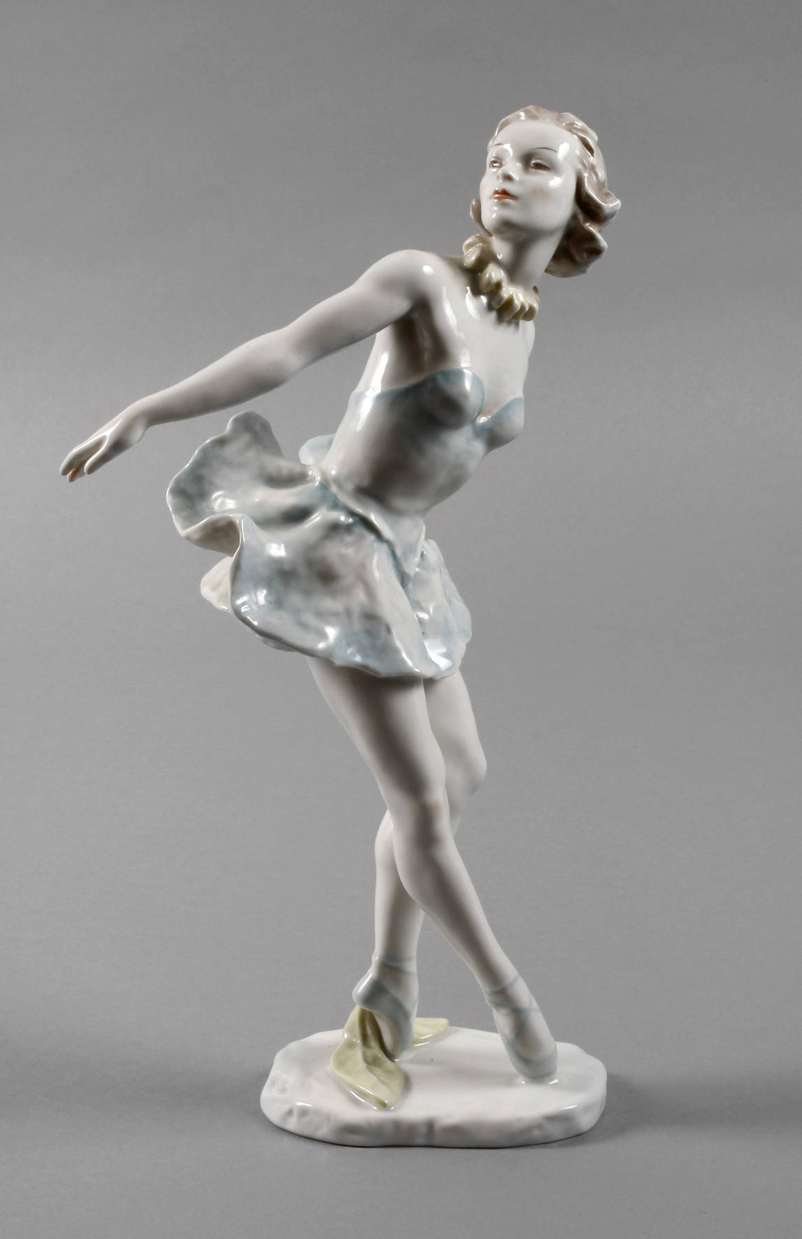 Entwurf Lore Friedrich-Gronau 1941, signiert und bezeichnet, grüne Stempelmarke ab 1957, Prägenummer 9, Schriftzug Handgemalt, gepinselte Nummer 7010 und Malermonogramm TB., Modellnummer 1737, naturalistische Ausformung und pastelltonige Aufglasurbemalung, auf ovaler Naturplinthe stehende Ballerina, H 34,5 cm.