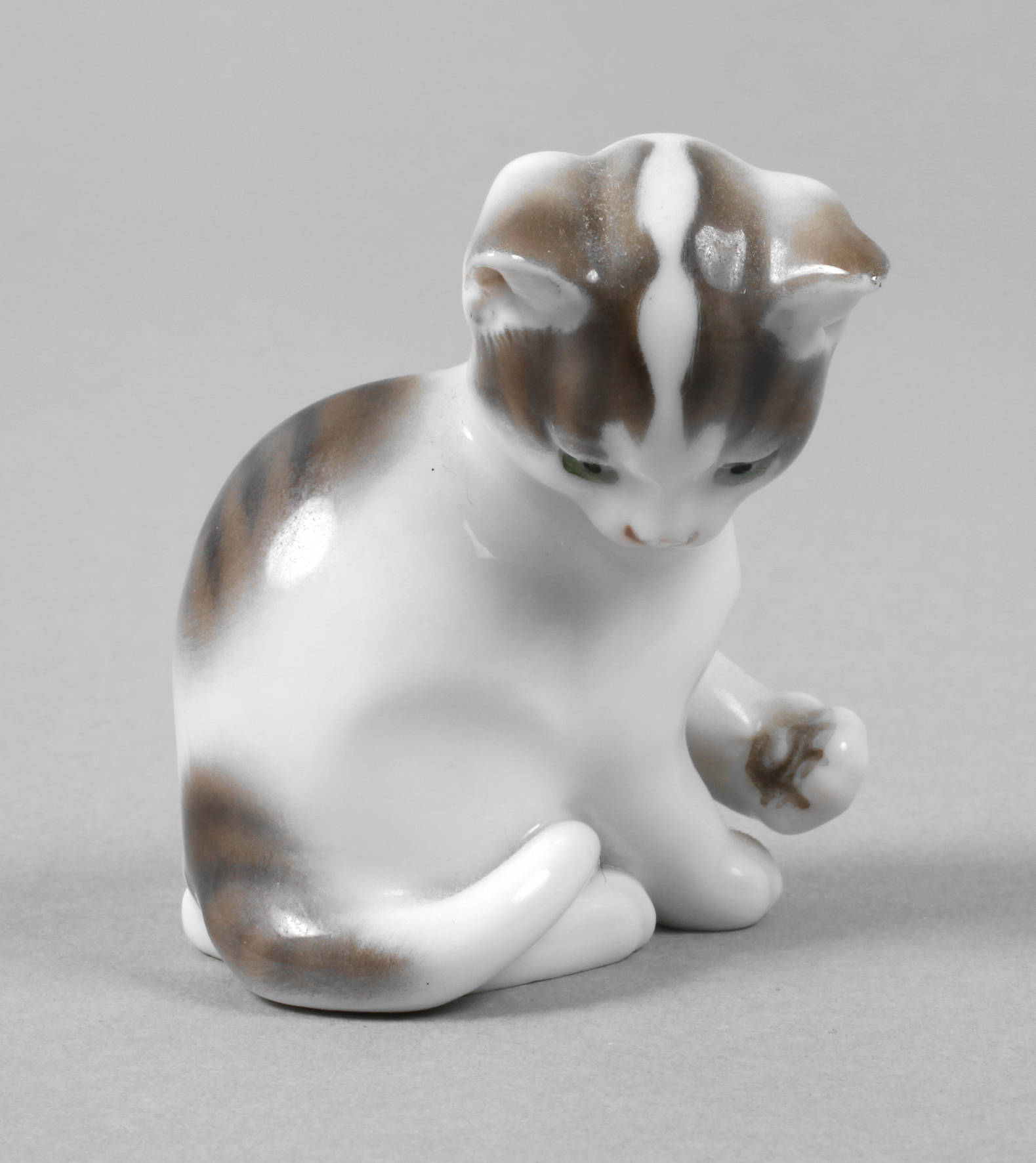Entwurf Theodor Kärner um 1923, grüne Stempelmarken mit Zusatz Germany ab 1957, Stempel handgemalt und Malermonogramm R, Modellnummer 131, naturalistische Ausformung mit zarter Unterglasurbemalung, sitzendes Kätzchen beim Spielen, H 5,5 cm.