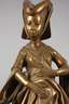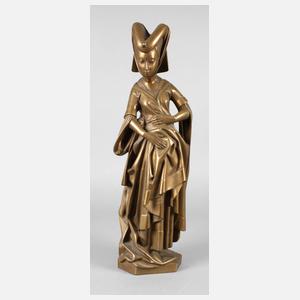 um 1900, unsigniert, Bronze, wohl Isabel de Portugal, Herzogin von Burgund, Darstellung einer Dame mit aufwendiger Kopfbedeckung und langem Kleid, die Hände vor dem Bauch verschränkt, altersgemäße gute Erhaltung, H gesamt 58 cm. Quelle: Internet.