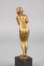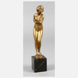 um 1910, unsigniert, Bronze hell bräunlich patiniert, stehendes nacktes Mädchen mit zu Schnecken aufgedrehten Haaren, ihren unbekleideten Leib mit den Armen schüchtern bedeckend, auf kleiner runder Plinthe und quadratischem Sockel aus dunklem Granatserpentin, minimal bestoßen, H Bronze 17 cm, H gesamt 22 cm. Künstlerinfo: Bildhauer in Berlin (1862–1935), war mit Portraitbüsten und Genrefiguren oft auf Berliner Ausstellungen vertreten (mehrere Akademieausstellungen, internationale Ausstellung 1891 und große Kunstausstellung 1893), beteiligte sich 1886 ohne Erfolg an der Konkurrenz um das Berliner Lessingdenkmal. Quelle: Thieme-Becker.