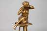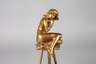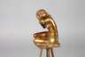 um 1900, unsigniert, Bronze vergoldet, auf einem Modelliertisch sitzende Skulptur, nackte Jugendstilschönheit mit wallendem Haar, Darstellung als Werkstück, auf hohem Modelliertisch drehbar gelagert, darunter Tonwerkzeug liegend, auf hexagonal facettiertem Marmorsockel liegend, dieser minimal bestoßen, H Bronzefigur 12 cm, H gesamt 29 cm.