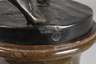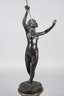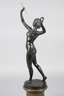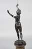 um 1900, seitlich der Plinthe Gießerstempel ”Echte Bronze O. Opitz” mit Buchstabe K und ”Bronze Garanti Stempel”, Bronze dunkel patiniert, stehende nackte Schönheit mit elegantem Haarknoten, die Arme weit ausgebreitet und die Fanfare zum Himmel gereckt, auf runder, naturalistisch gestalteter Plinthe, auf einen hohen, getreppten und gekehlten Sockel aus Granatserpentin montiert, Patina mit Altersspuren, Montierung locker, H Bronze 52 cm, H gesamt 66 cm.