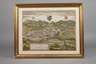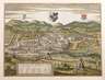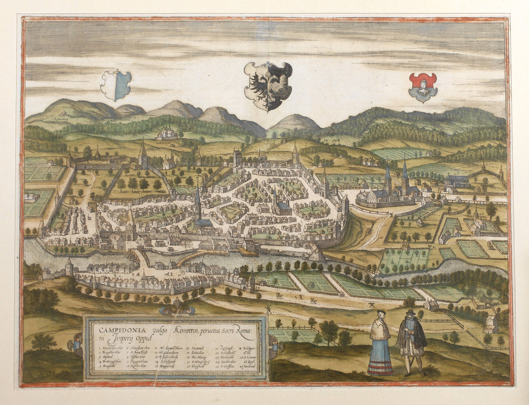 Panoramaansicht der Stadt mit ihren Befestigungsanlagen und den Alpen im Hintergrund, neben der Figurenstaffage, in der Kartusche betitelt ”Campidonia vulgo Kemptten peruetus Sacri Romani Imperij Oppid” und ausführliche Legende, im Bereich des Himmels drei Wappen, aus einer lateinischen Ausgabe der „Civitates Orbis Terrarum, kolorierter Kupferstich um 1575, Quetschfalte im Druck, leichte Altersspuren, unter Passepartout und hinter Glas gerahmt, Darstellungsmaß ca. 33,5 x 44,7 cm. Info: In Zusammenarbeit von Frans Hogenberg (dt. Kupferstecher und Radierer, 1535 Mecheln bis 1590 Köln) und Georg Braun (dt. Theologe, Kanoniker und Herausgeber, 1541 Köln bis 1622 Köln) entstand um 1570 in Ergänzung des bedeutenden Atlaswerkes „Theatrum Orbis Terrarum“ des Niederländers Abraham Ortelius (1527-1598) das Städteansichtenbuch „Civitates Orbis Terrarum (Schefold übersetzte den Titel mit: Beschreibung und Contrafactur der Vornembster Stät der Welt).“ mit letztendlich 600 wirklichkeitsnahen Stadtansichten und Stadtplänen, das Werk wurde im Zeitraum 1572-1618 in 6 Bänden herausgegeben, wobei die Kupferstiche von Band 1-4 von Hogenberg stammten, nach dessen Tod lieferte Simon Novellanus die Stiche für Band 5 und 6, die Druckplatten kamen später in den Besitz des holländischen Kartenherstellers Jan Jansson welcher sie mit verschiedenen Modifikationen 1657 in Amsterdam neu auflegte, Quelle: Thieme-Becker und Internet.