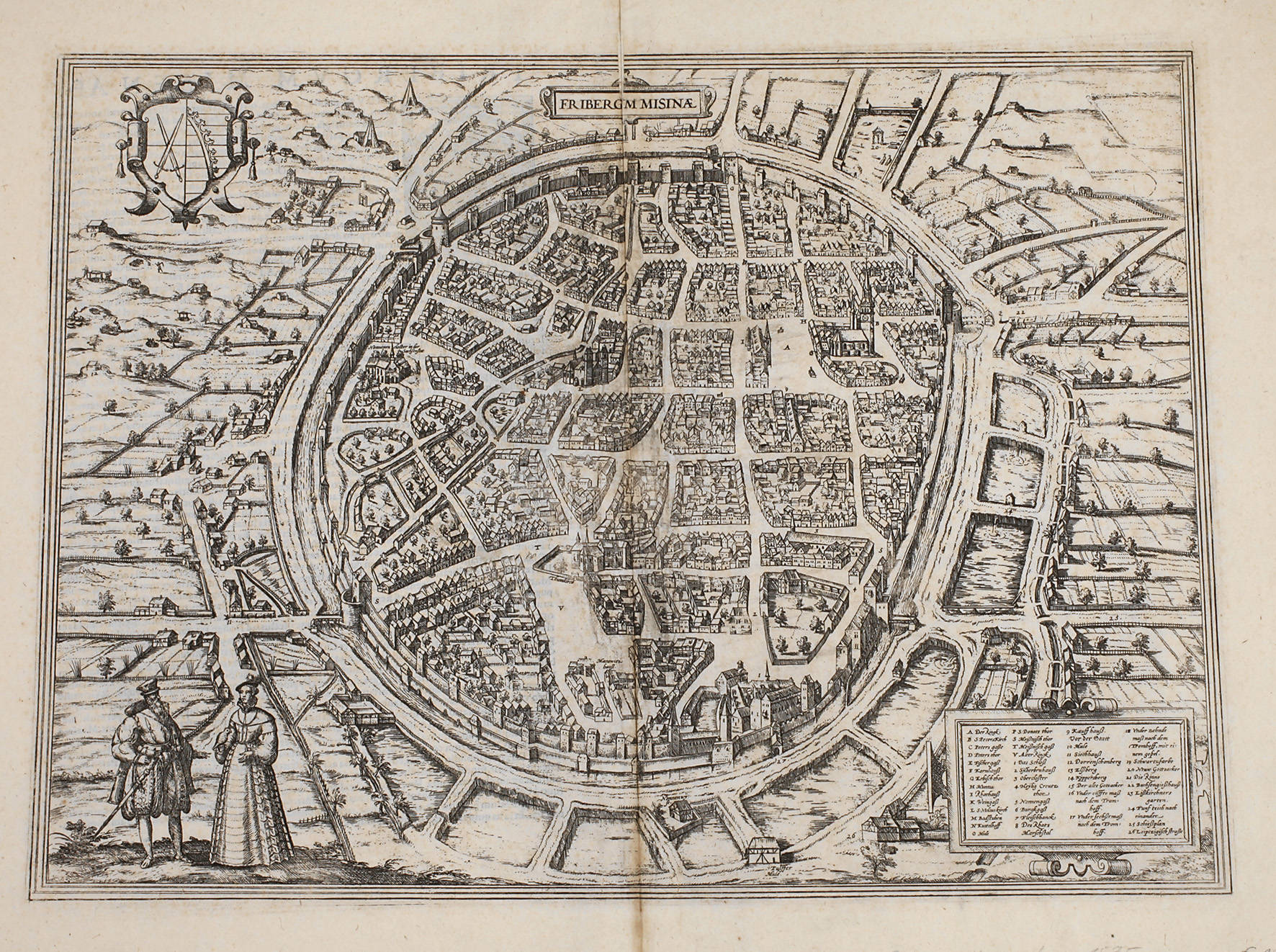 bezeichnet Fribergum Misinae, die Stadt aus der Vogelschau, mit Personenstaffage in Form zweier Edelleute, oben links kurmeißnisches Wappen, Gebäudeindex, Kupferstich, unsigniert, aus dem Städteatlas ”Civitates orbis terrarum” von Georg Braun und Frans Hogenberg, Köln, um 1575, verso Buchseite in Latein, Bugfalz, geringe Erhaltungsmängel vor allem im Bereich des Falzes, ungerahmt in Passpartoutmappe, Darstellungsmaß ca. 33,5 x 45,5 cm. Künstlerinfo: Maler, Kupferstecher und Verleger (vor 1540 in Mecheln bis um 1590 in Köln), Stiefvater war der Kartenmacher Hendrik Terbruggen (Pontanus), Zuflucht in Köln 1570, nachdem er wegen der religiösen Unruhen in den Niederlanden verbannt wurde. Quelle: Thieme-Becker und Wikipedia.