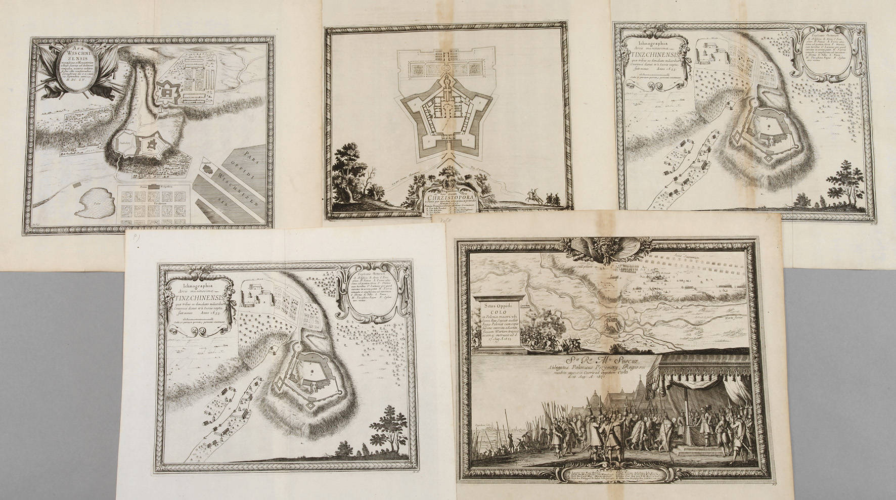 aus Chronik von Samuel von Pufendorf, Nürnberg, 1697, fünf Blatt, 1.) Situs Oppidi Colo... 1655, Belagerung von Kolo/Kolo, 2.) zweimal Ichnographia Arcus munitissimae - Tinchinensis... 1655, 3.) Arx Wischnizensis... 1655, 4.) ... Chrzistopora... 1655, Chrzistopora bei Sandomir, Kupferstiche, teilweise in der Platte signiert Lapointe, mittig übliche Faltlinie, unterschiedliche Erhaltungen, Darstellungsmaß max. ca. 29 x 37 cm.