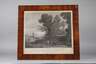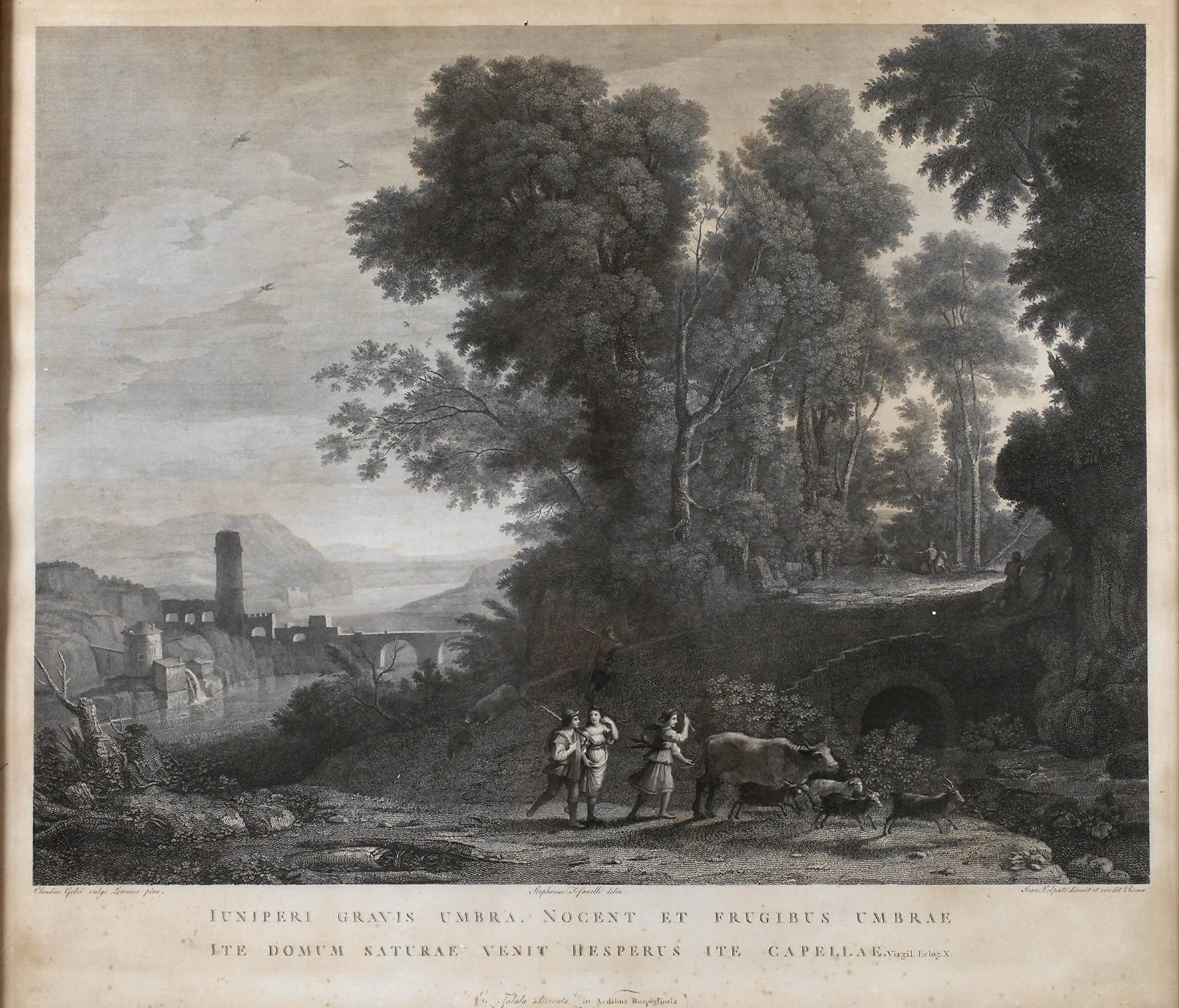 Gruppe von Bauern mit ihrem Vieh in bergiger, bukolischer Landschaft, vor mächtigen Laubbäumen, links Blick in ein weites Tal mit Steinbogenbrücke, nach einem Gemälde von Claude Lorrain, unter der Darstellung ausführlich betitelt, malerisch wirkender Kupferstich in der für den Künstler so typischen Manier, um 1780, unter der Darstellung, in der Platte signiert rechts Joan. Volpato direxit et vendit Roma, links Claudius Geleé vulgo Lorenese pnx. sowie mittig Stephanus Tofanelli delin, leichte Altersspuren, hinter altem Glas in ca. 7 cm breiter schlichter, edelholzfurnierter Holzleiste mit gesägten und versperrten Ecken gerahmt (leichte Erhaltungsmängel, Falzmaß ca. 55,5 x 63,5 cm), Darstellungsmaß ohne Schrift ca. 44,5 x 57,8 cm. Künstlerinfo: italienischer Radierer (1733 Bassano bis 1803 Rom), Lehre als Steinmetz, 1760-62 Schüler an der Calcografia Remondini in Bassano, folgte anschließend Bartolozzi nach Venedig, ab 1772 in Rom ansässig, betrieb hier auch eine Schule für Kupferstich, 1786 gründete er in Via Pudenziana eine Porzellanfabrik, Pabst Pius verlieh ihm das Privileg der Nachbildung von Altertümern, Quelle: Thieme-Becker und Internet.