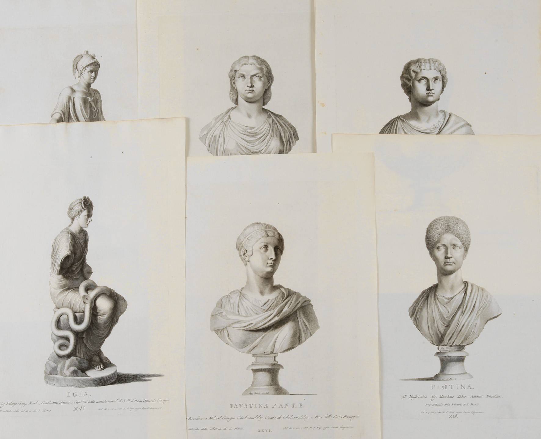 20 Blatt, jeweils mit Darstellung einer antiken Büste oder Statue, im unteren Bereich bezeichnet und in der Platte unterschiedlich signiert, zum Bsp. G. Cattini, A. Faltoni, G. Patrini und Carlo Gregori, Mitte 18. Jh., meist gute Erhaltungen, Blattmaß max. 51,5 x 53 cm.