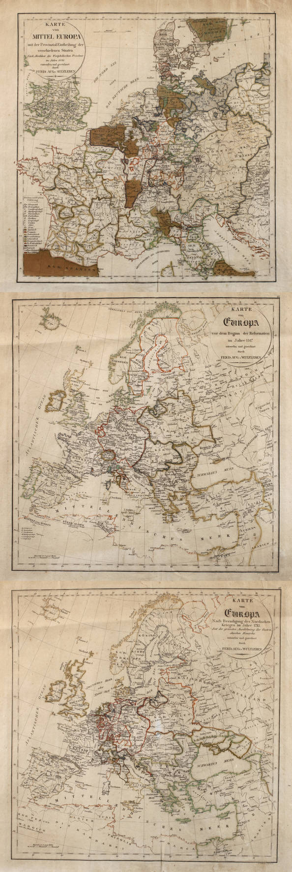 drei Karten aus dem ”Geschichtlich-geographischen Atlas von Europa, von der Errichtung der ersten Staaten bis zu den neuesten Zeiten, oder vom Jahre 2000 nach der Erschaffung der Welt bis 1832 nach Christo, zum Gebrauch für höhere Schulen bearbeitet von Ferdinand August von Witzleben”, Karte 1: Karte von Europa vor dem Beginn der Reformation im Jahre 1517, 2: Karte von Mitteleuropa mit der Provinzial-Eintheilung der verschiedenen Staaten nach Abschluss des Westphälischen Friedens im Jahre 1648, Karte 3: Karte von Europa nach Beendigung des Nordischen Krieges im Jahre 1723, Kupferstiche, um 1833, unten rechts signiert ”bei K, Kolbe gest. v. A. Heimburger”, Altersspuren, Ränder bestoßen, Faltränder, hinter Glas gerahmt, Darstellungsmaße ca. 38,5 x 38 cm.