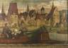 Wie Albrecht Dürer auf seiner Reise nach den Niederlanden bei Sulzfeld am Main vorbeifährt am 16 Juli 1520, der im Kahn stehende Künstler, den Blick auf die Stadt gerichtet, großformatiges Blatt, Farblithographie, rechts unten im Druck signiert, datiert und bezeichnet M. Schiestl 1903 München sowie ausführlich an der Unterkante betitelt, leichte Altersspuren, hinter Glas in breiter Holzleiste gerahmt, (minimal bestoßen), Falzmaß ca. 70,5 x 100,5 cm. Künstlerinfo: dt. Maler und Graphiker (1869 Gnigl bis 1939 München), Sohn des Bildschnitzers Matthäus Schiestl dem Älteren, ab 1879 war die Familie in Würzburg ansässig, Lehre in der Werkstatt des Vaters, ab 1894 Studium an der Akademie der Bildenden Künste in München bei Wilhelm von Diez und Ludwig von Löfftz, 1905 Bildungsreise nach Ägypten, 1912 Ernennung zum Professor, 1920-39 als Maler in St. Wendel tätig, Quelle: Thieme-Becker, Österreichisches Biographisches Lexikon 1815-1950 und Wikipedia.