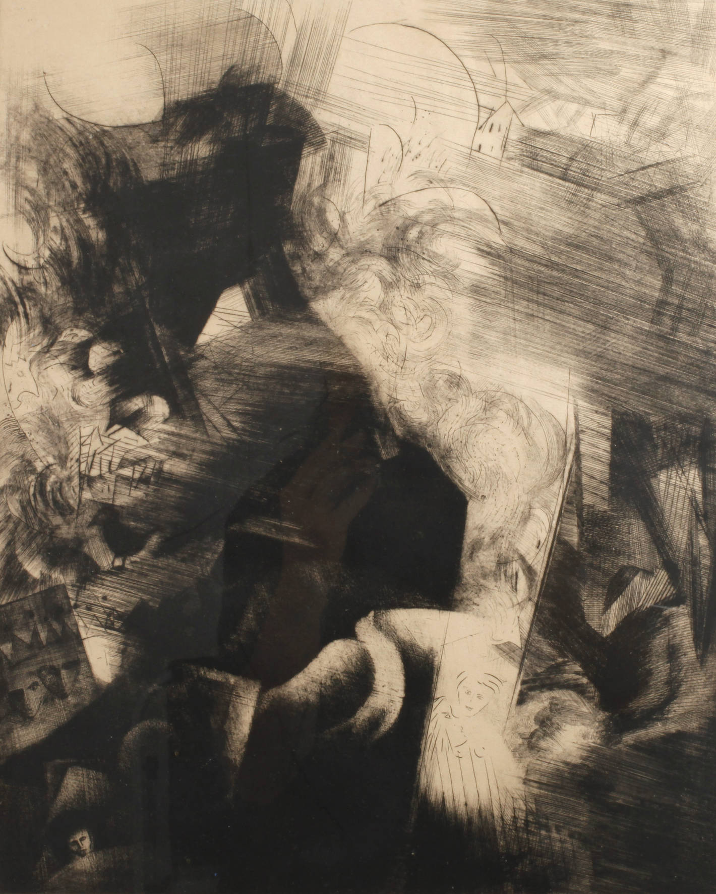 stark abstrahierte Komposition aus urbanen Versatzstücken mit Figuren, großformatige Radierung, unter der Darstellung rechts unleserlich signiert und datiert Bernd Knorr (?) X.(19)27, leichte Erhaltungsmängel, im Wechselrahmen, Darstellungsmaß ca. 46,5 x 37,5 cm, Blattmaß ca. 56 x 45 cm.