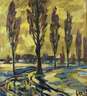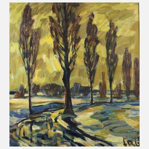 verschneite vogtländische Winterlandschaft, mit Pappeln am Weg, im Licht der abendlichen Sonne, pastose Malerei mit breitem Pinselduktus in kraftvoller Farbigkeit, Öl auf Karton, rechts unten monogrammiert und datiert ”FB (19)65”, rückseitig auf dem Karton vom Künstler signiert, betitelt und datiert ”Fredo Bley, Pappelweg in Obermylau, gemalt 1965” sowie Dedikation von fremder Hand ”Meiner lieben Rosel zur Erinnerung - Volker”, gerahmt, Falzmaße ca. 75,5 x 68,5 cm, beigegeben Langspielplatte der Firma Nova von 1974 ”Ernst Hermann Meyer - Violinkonzert” mit Abbildung eines Ausschnitts des vorliegenden Gemäldes auf dem Cover (hier bezeichnet ”Titelseite: Fredo Bley, Pappelallee in der Wintersonne”). Künstlerinfo: eigentlich Fredo Robert Bley, dt. Maler und Graphiker (1929 Mylau im Vogtland bis 2010 Reichenbach), 1943-46 Lithographenausbildung bei Carl Werner in Reichenbach, 1948-56 Lehre und Tätigkeit als Dekorations- und Schriftenmaler, Anregung durch den Maler Walter Löhner, weitestgehend Autodidakt, seit 1952 Mitglied des Verbandes Bildender Künstler (VBK) der DDR, 1957-64 als Ziegelei- und Baufacharbeiter tätig, ab 1966 freischaffend, beschickte zahlreiche Ausstellungen, unter anderem 2002 im neuen Bundeskanzleramt Berlin, tätig in Mylau, später in Buchwald, Quelle: AKL, Eisold ”Künstler in der DDR”, Frank Weiß ”Malerei im Vogtland” und Wikipedia.