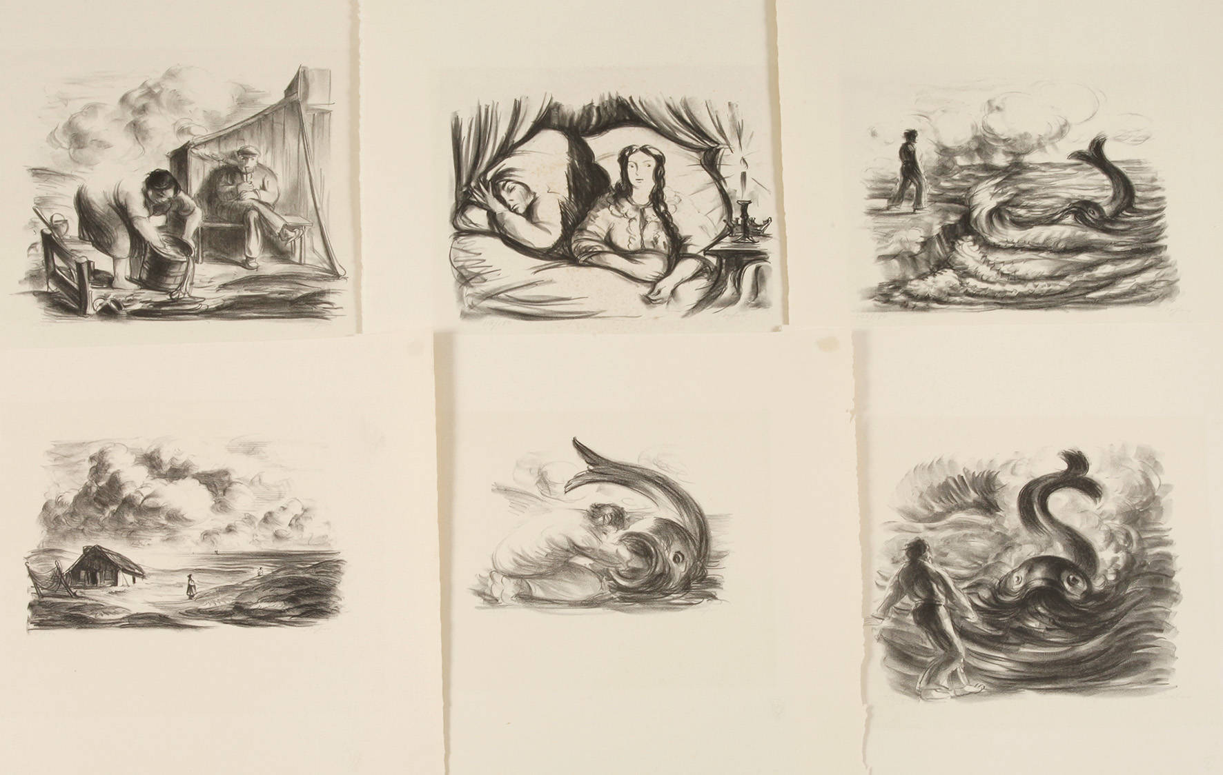 sechs Blatt aus der Folge Vom Fischer und sine Fru, erschienen bei der Marées-Gesellschaft, Lithographien, 1923, jeweils unter der Darstellung rechts in Blei signiert Dreher, je eines von 180 Exemplaren, weiterhin jedes Blatt mit dem Trockenstempel der Marées-Gesellschaft versehen, unterschiedliche Erhaltungen, Darstellungsmaß max. ca. 22 x 25 cm, Blattmaß max. ca. 50,5 x 38 cm. Künstlerinfo: eigentlich Eduard Richard Dreher, dt. Maler, Illustrator und Graphiker (1875 Dresden bis 1932 Dresden), weitestgehend Autodidakt, 1889-92 Lithographenlehre in Dresden, 1892 Wechsel zu einem Lithographen nach Berlin und später als Retuscheur bei einem Fotografen in Berlin tätig, um 1900 Rückkehr nach Dresden, 1908/09 als Villa-Romana-Preisträger in Florenz, 1912 Südfrankreichaufenthalt, beschickte zahlreiche Ausstellungen, unter anderem die der Sezessionen in München und Berlin, die Künstlerbundausstellungen, ab 1910 Einzelausstellungen in der Galerie Arnold in Dresden, tätig in Rockau bei Dresden, ab 1916 Sommerhaus in Elbersdorf, 1919 als Professor an die Dresdner Akademie berufen, 1927 krankheitsbedingter Umzug ins Wasserpalais des Schlosses Pillnitz, Quelle: Thieme-Becker, Vollmer und Internet.
