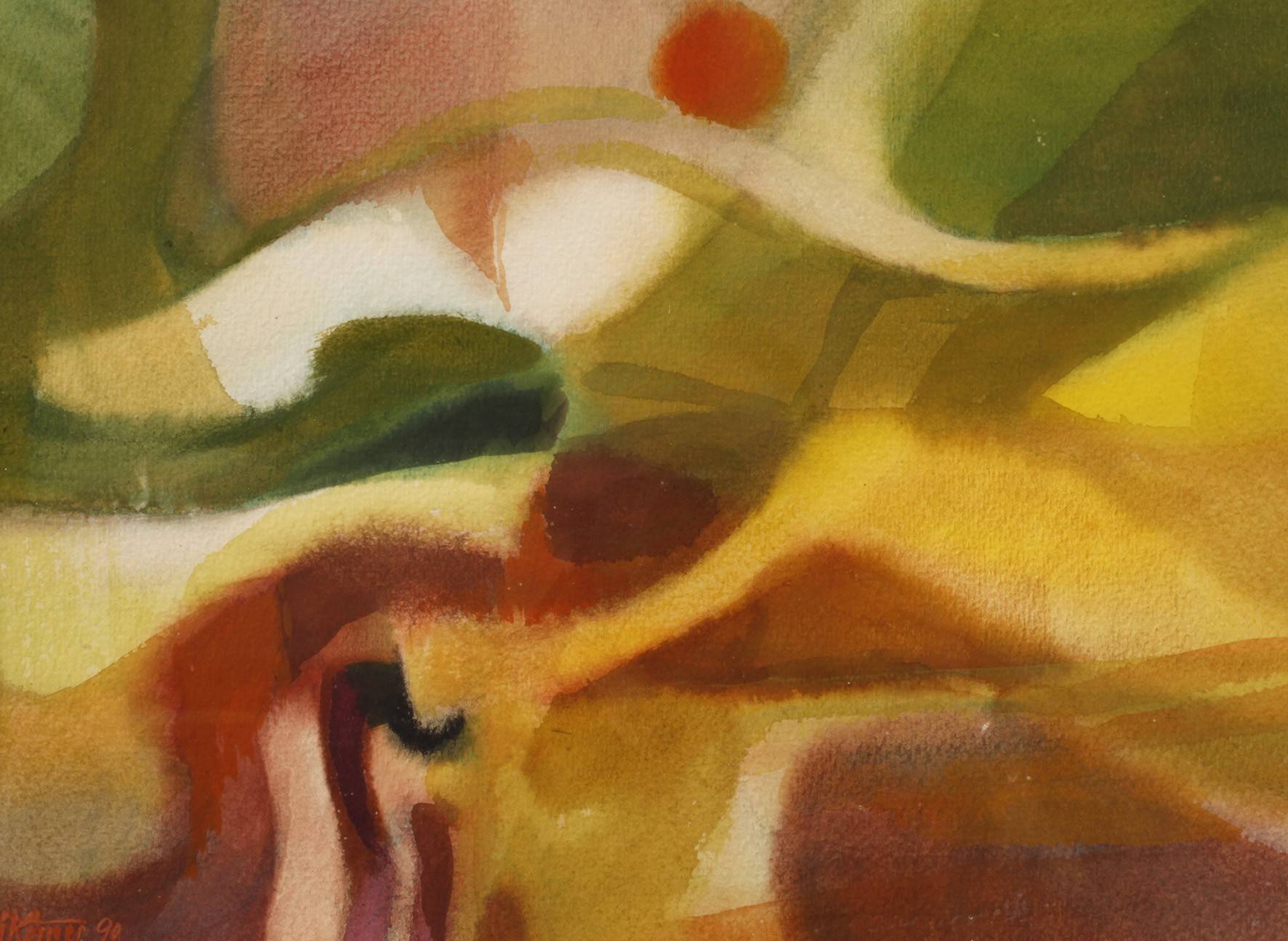 abstrakte Komposition in warmen, leuchtenden Farben, Aquarell auf Karton, links unten signiert und datiert G. Körner (19)90, unter Passepartout und hinter Glas gerahmt, Passepartoutausschnitt ca. 24,5 x 33,5 cm. Künstlerinfo: dt. Maler und Graphiker (1927 Werdau bis 2015 Dresden), zunächst Lehre zum Lithograph, anschließend Kriegsdienst, 1945-51 freischaffend in Werdau, 1951-56 Studium an der Hochschule der Bildenden Künste in Dresden, nachfolgend freischaffend, Mitglied des VBK der DDR, tätig in Dresden-Gruna, Quelle: Eisold ”Künstler in der DDR” und Internet.