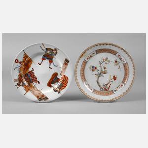 um 1900, einer gemarkt, Porzellan in polychromer Aufglasurbemalung und Goldstaffage, gemuldeter Zierteller mit figürlicher Darstellung kämpfender Samurai, sowie Zierteller mit Blütendekor, dieser alt repariert, brandfleckig, Altersspuren, D je 22 cm.