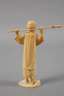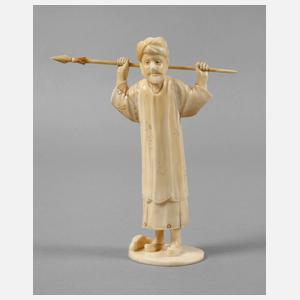 um 1900, ungemarkt, Elfenbein fein beschnitzt, teils graviert und geschwärzt, stehender Beduine mit Turban und Lanze, min. trocknungsrissig, H 14,5 cm.