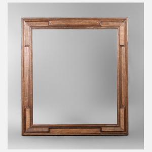 Rahmen aus ca. 14 cm breiter, zur Rahmenmitte schwach ansteigender, profilierter und mit schmalen Flammleisten und gedrehtem Stab verzierter Holzleiste, die Ecken wurden mit applizierten Wellenleisten betont, Gehrungen geschnitten, reale und künstliche Altersspuren, Falzmaße ca. 110,05 x 100,5 cm.