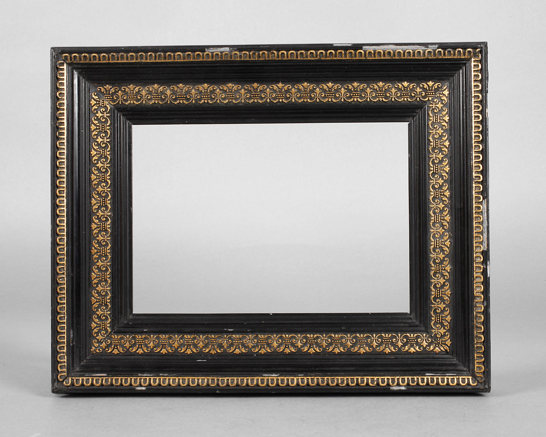 um 1880, Rahmen aus ca. 6,5 cm breiter, profilierter, teilweise gestuckter und vergoldeter, bzw. dunkel gefasster Holzleiste, Gehrungen geschnitten, leichte Verluste, Falzmaß ca. 25,5 x 18 cm.