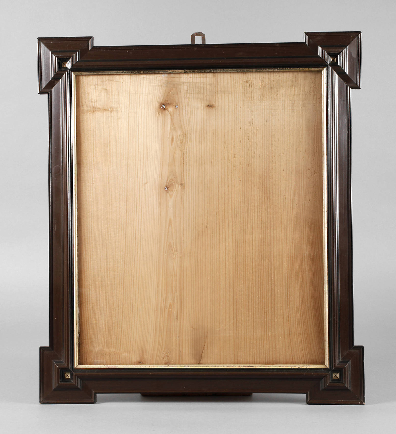 um 1880, aus ca. 4,5 cm breiter, profilierter und farbig gefasster Holzleiste mit ausgestellten Ecken, eingelegt Glasscheibe und Holzrückwand, minimale Altersspuren, Falzmaß ca. 47 x 41 cm.