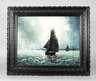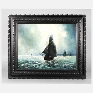 Rahmen aus zur Mitte hin ansteigend profilierter, partiell mit Blattdekor beschnitzter, ebonisierter Holzleiste, Gehrungen geschnitten, Altersspuren, Ölgemälde einer mit ”LR.” monogrammierten, nächtlichen Seelandschaft mit Segelbooten als Beigabe, Falzmaß ca. 51 x 65 cm.