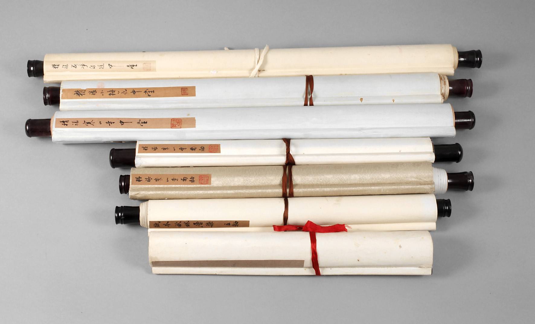20. Jh., alle signiert bzw. gestempelt, Mischtechnik auf Papier bzw. Seide, teils mit Ornamentstoff gefasst, Landschaftsdarstellungen sowie Floralmotive, drei im original Etui, die Schmalseiten jeweils mit Holz verstärkt, unterschiedliche Maße und Erhaltungen.