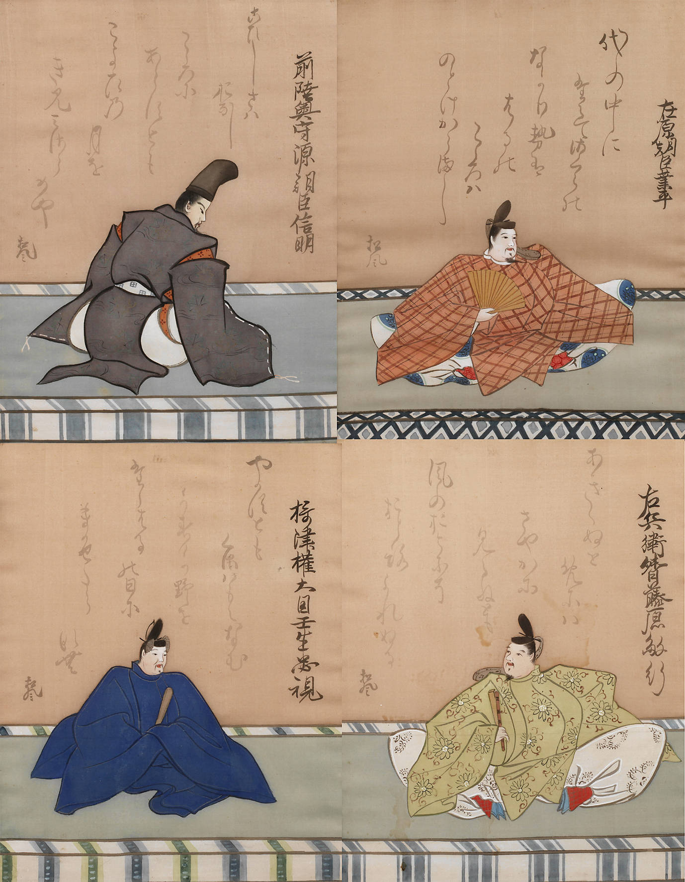 Anfang 20. Jh., alle signiert und japanisch bezeichnet, Gouache auf Seide, Darstellungen männlicher Sitzfiguren im opulentem Habit im Interieur, teils kleinere Erhaltunsgmängel, alle hinter Glas in geschwärzten Leisten gerahmt, Maße je ca. 42 x 33 cm.
