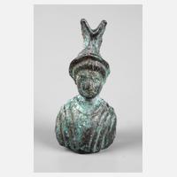wohl römisch, 2./3. Jh., Brustbildnis der Göttin Minerva, Loch durch die Helmzier ermöglichte ein Tragen als Anhänger/Amulett, rückseitiges Unterteilt der Bronze muldenförmig ausgespart, Patina, H ca. 40 mm, G ca. 17,6 g.