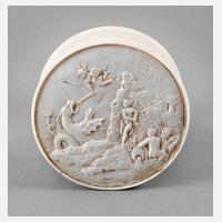 18. Jh., ungemarkt, Elfenbein fein beschnitzt und mehrteilig montiert, Runddose mit hoher Zarge und flachem Deckel, dieser mit qualitätvoller, im Hochrelief gearbeiteter mythologischer Szene von Perseus und Andromeda, welche von Poseidon, an einen Felsen gekettet, dem Meeresungeheuer Ketos geopfert werden sollte, Darstellung des Kampfes zwischen Perseus und Kretos auf der linken Bildhälfte, während Poseidon und eine Nereide im Vordergrund zu sehen sind, im Zentrum Darstellung der schönen, halbbekleideten Andromeda in Not, Bodenplatte alt rep., Zarge mit Trocknungsriss, Deckel winz. best., D 11 cm.