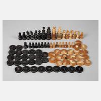 Ende 19. Jh., Horn gedrechselt und teils dunkel eingefärbt, kompletter Satz Schachfiguren (eine Figur ergänzt) sowie 18 + 28 Spielsteine für Dame oder Backgammon, Gebrauchsspuren, H König 7,5 cm.