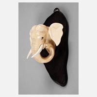 wohl Erbach, um 1900, Elfenbein mehrteilig geschnitzt und montiert, teils graviert und geschwärzt, vollplastisch gearbeitetes Elefantenhaupt, auf organisch geschwungene Ebenholzplatte montiert, trocknungsrissig, H ges. 15 cm.