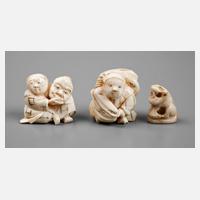 um 1900, Elfenbein fein beschnitzt, teils graviert und geschwärzt, vollplastisch gearbeitete figürliche Darstellungen, Sitzende mit geschultertem Sack, Sitzender mit No-Maske sowie miniaturhafter Wächterlöwe, kleinste Fehlstelle, Altersspuren, H max. 2,5 cm.