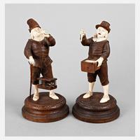 19. Jh., ungemarkt, Elfenbein fein beschnitzt, teils graviert und geschwärzt, sowie Buchsbaum und Eiche, dunkelbraun gebeizt, vollplastisch gearbeitete Darstellung zweier Marktschreier in historisierenden Gewändern, Fischhändler und Taubenzüchter, Altersspuren, winz. best., H je 23,5 cm.