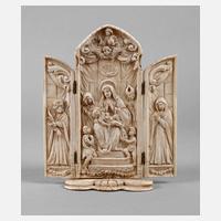 18. Jh., unsigniert, Elfenbein mehrteilig gearbeitet, montiert und beschnitzt, Miniaturaltar mit zentraler Darstellung der thronenden Muttergottes mit dem Christusknaben, gerahmt von Heiligenfiguren und bekrönt von Gottvater sowie dem Heiligen Geist in Form einer Taube, die Flügel mit reliefierten Heiligenfiguren vor Architekturkulisse, passig geschweifter Stand, alt rep., Altersspuren, H 20 cm.