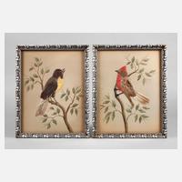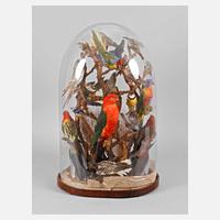 Anfang 20. Jh., Schaukasten mit 14 verschiedenen präparierten Sing- und Paradiesvögeln, auf Geäst montiert, flankiert von organischem Zierrat, unter Glassturz, dieser defekt, sonst normale Altersspuren, H 75 cm.