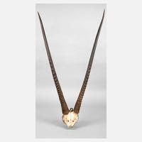 Anfang 20. Jh., prächtiges Gehörn einer südafrikanischen Oryxantilope, auf runder Nussbaumplatte montiert, min. Altersspuren, H 85 cm.