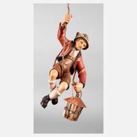 20. Jh., Holz geschnitzt und farbig gefasst, rückseitig mit originalem Klebeetikett ”Nebelhorn Holzschnitzerei Alois Ohmayer Bildhauer Oberstdorf Allgäu”, vollplastische Darstellung eines jungen Burschen in Tracht, in seiner Hand eine kleine Laterne aus Kupferblech haltend, diese einflammig elektrifiziert, H 30 cm.