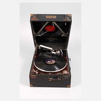 1930er Jahre, gemarkt Columbia sowie bezeichnet Vivatonal Grafonola Nr. 1120, weiteres Etikett Sydney Scarborough Hull, gravierte Messingplakette mit Dedikation am Gehäuse, dieses aus lederummanteltem Holz mit verchromten Metallteilen, klappbare Kurbel, beigegeben sechs Platten, funktionstüchtig, Alters- und Gebrauchsspuren, Maße 16 x 30 x 41 cm.